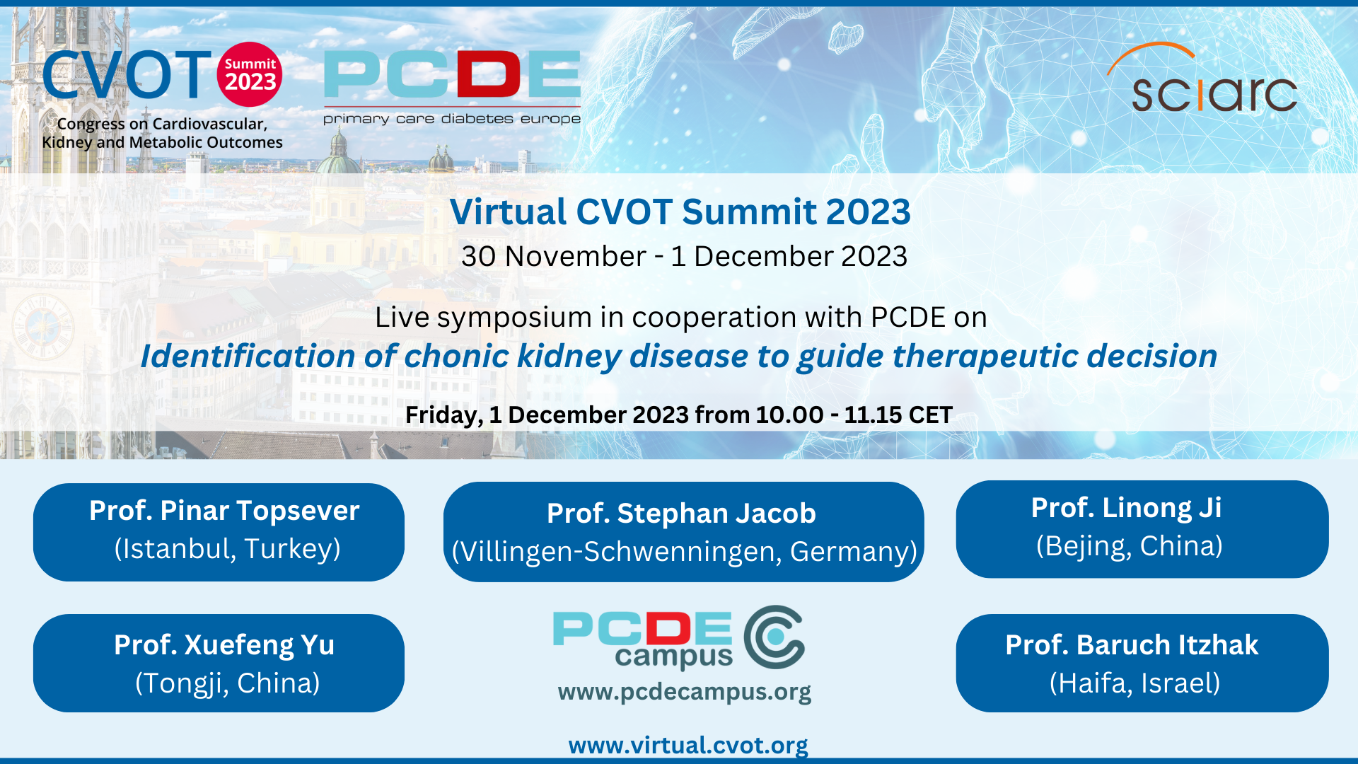 With the increasing burden of chronic kidney disease (CKD), screening and management of CKD remains a challenge for healthcare professionals. The virtual CVOT Summit 2023 on Cardiovascular, Kidney and Metabolic Outcomes will take place from November 30 to December 01. We invite you to join the live stream (CVOT link) to attend the live symposium on "Identification of chronic kidney disease to guide therapeutic decision", organized in cooperation with PCDE. In this symposium, renowned experts from around the world will shed light on the identification, diagnosis, and management of people with CKD in the primary care setting.